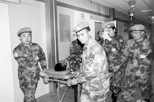 2月13日,在位于黎巴嫩南部的中国赴黎维和医疗分队医院,中国医务人员迅速将“重伤员”转移至急救室。 中国第17批赴黎维和医疗分队当天在黎巴嫩与以色列边境“蓝线”附近参加联合国驻黎巴嫩临时部队(联黎部队)代号“东区天使2019-1”应急医疗救援演练,西班牙、印度尼西亚、尼泊尔等7个国家的维和官兵参加演练,中国医疗分队负责伤员接收、抢救及医疗后送工作。 新华社发