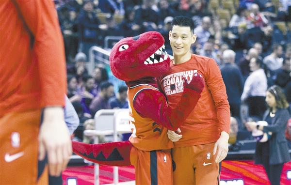 当地时间2月13日,猛龙队球员林书豪(右)赛前与猛龙队吉祥物拥抱。 当日,新近转会至多伦多猛龙队的NBA华裔球员林书豪参加赛前训练,备战猛龙队对阵华盛顿奇才队的常规赛。 新华社发