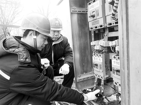 2月17日,周口供电公司保电班班长王银芳(左)与同事一起在周口公园内检查用电负荷。为保障元宵节期间灯会正常用电,周口供电公司成立元宵节保电工作小组,加强对重点区域、重点场所、重点设备的巡视维护。据了解,自2月16日(正月十二)开始,周口供电公司抽调专人分别在周口公园、和谐公园、市文化艺术中心、开发区人民广场、川汇区文化广场不间断地对供电设备和线路进行巡视。 记者 窦娜 摄