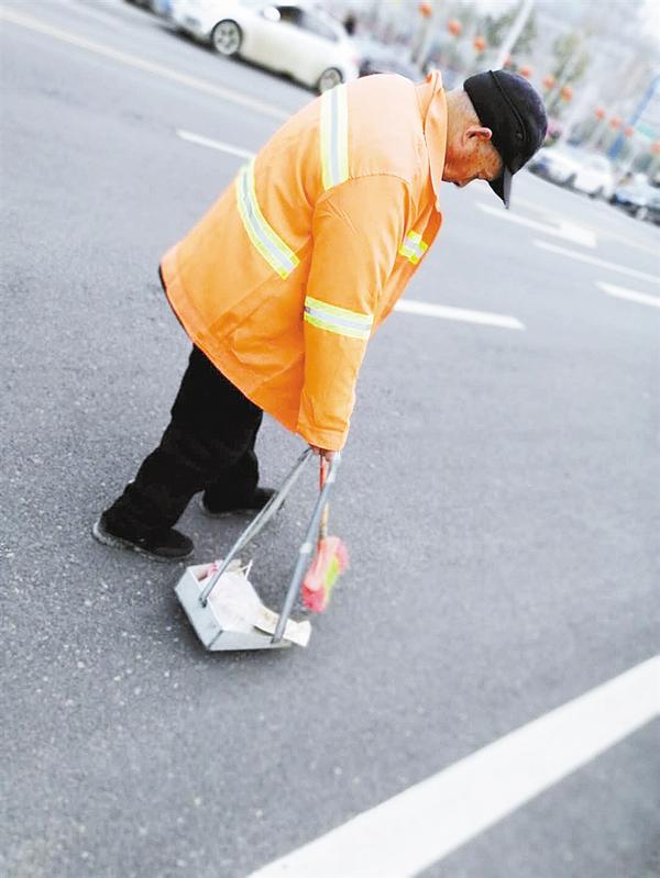 2月19日(正月十五)下午,一名环卫工人在和谐公园西侧的政通路上打扫卫生。