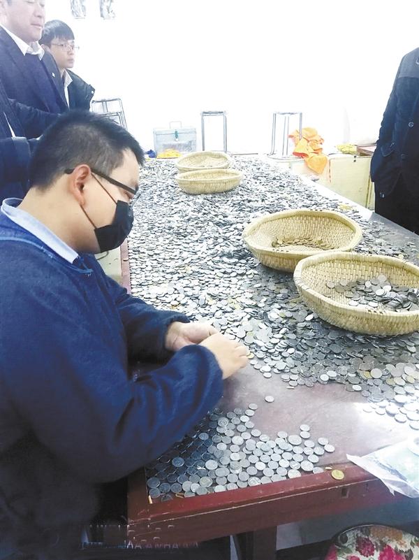 2月21日下午,中原银行淮阳支行行长李胜利及周口分行有关负责人张诗剑带领工作人员将全自动分币清点机运到了太昊陵管理处。在回收硬币工作室,记者见到成麻袋的硬币摆了一地,尚未分拣的硬币占据了两张大桌子,几名工人正紧张地分拣硬币(如图)。据介绍,每公斤硬币大约是166元。这台机器每天可处理10万元、约600公斤硬币,而且清点后自动对各类硬币包装封存。若是人工清点,平均一人一小时仅清点1000枚硬币,金额不大,劳动量却很大。