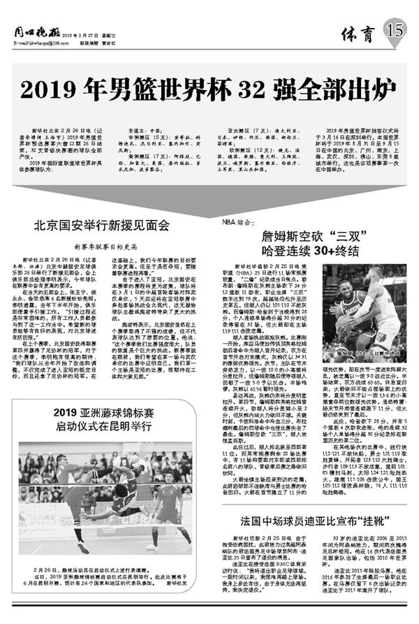 新华社华盛顿2月25日电 美职篮(NBA)25日进行11场常规赛较量,“二詹”纪录成当日焦点。勒布朗·詹姆斯在灰熊主场砍下24分12篮板11助攻,职业生涯“三双”数字达到79次,超越张伯伦升至历史第五,但湖人仍以105∶110不敌灰熊。而詹姆斯·哈登则于当晚得到28分,个人连续单场得分超30分的纪录停留在32场,但火箭却在主场119∶111击败老鹰。