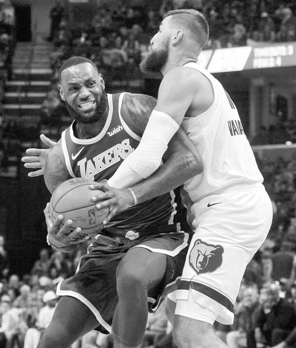 湖人客场挑战弱旅灰熊。比赛刚一开始,库兹马便妙传弧顶英格拉姆助后者命中为湖人首开纪录,双方在首节开启对攻模式,灰熊仅以34∶31的微弱优势领先。次节,主队在节末突然发力,以一波10∶0的小高潮将分差拉开,但詹姆斯随后便带领湖人回敬了一波5∶0予以反击。半场鸣锣,灰熊以61∶56暂时领先。