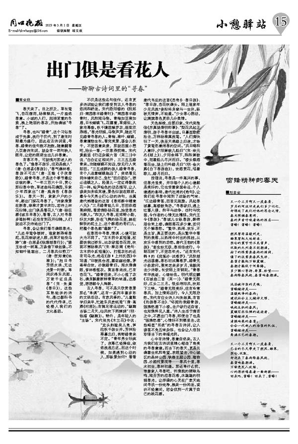 寻春,会让我们看尽满眼春光。“几处早莺争暖树,谁家新燕啄春泥。乱花渐欲迷人眼,浅草才能没马蹄”(唐·白居易《钱塘湖春行》);“碧玉妆成一树高,万条垂下绿丝绦。不知细叶谁裁出,二月春风似剪刀”(唐·贺知章《咏柳》);“胜日寻芳泗水滨,无边光景一时新。等闲识得东风面,万紫千红总是春”(宋·朱熹《春日》),这些耳熟能详的诗句,通过教科书的代代传承,已经浸入我们的文化基因。