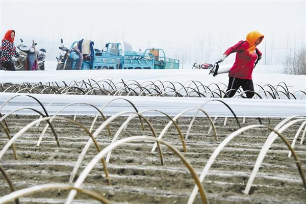 3月5日,山东省莱西市夏格庄镇西曲格庄村村民在为刚播种的胡萝卜覆膜。