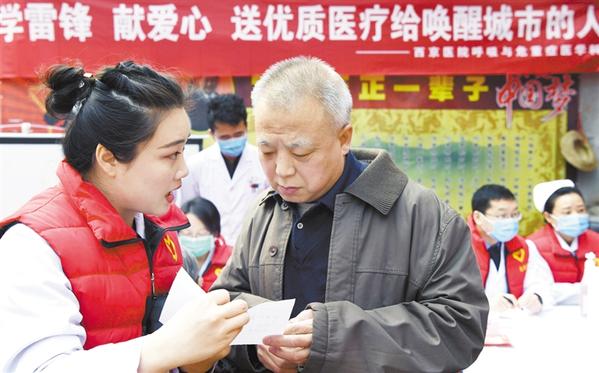 3月5日,西京医院呼吸内科志愿者们(左)在西安街头解答市民疑难问题。