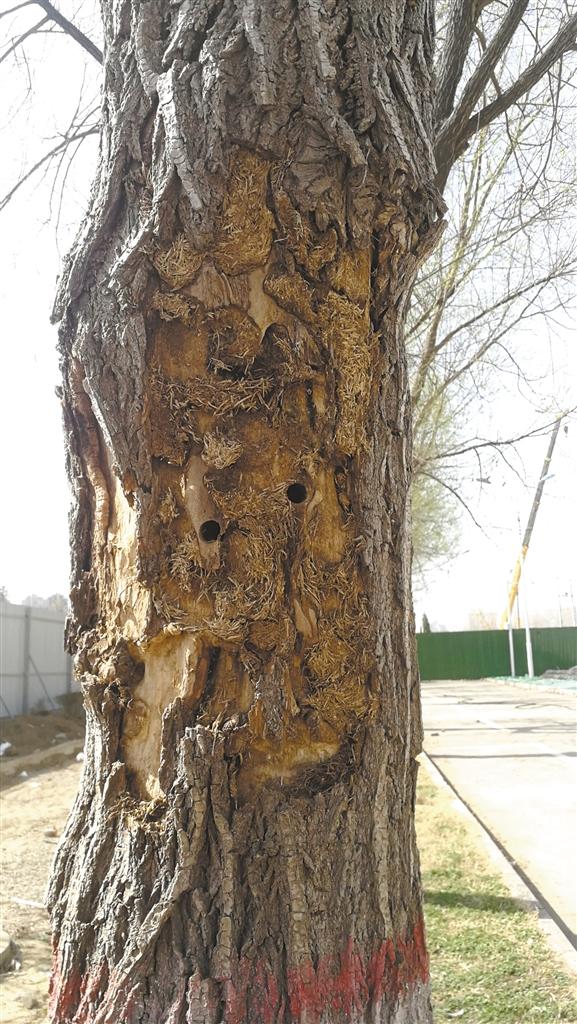 “我每天接送孩子都要经过这里,以前没在意,这几天送完孩子在附近转转,才发现多棵垂柳的树干被虫蛀了,有的还很严重。”张女士表示,这些垂柳生长好多年了,非常漂亮,如果被虫蛀死了,挺可惜的。