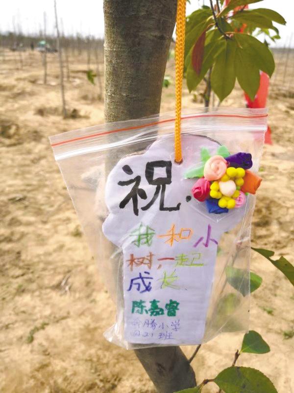 本报讯 “我和小树一起成长!”“希望我的小树不受别人损坏!”3月17日,周口森林公园春光明媚,来自周口奔腾小学和文昌小学的周口报业小记者陈嘉睿、岳祝新,在刚刚种好的那两棵红叶石楠树苗上,挂上创意美好的“心愿卡”。