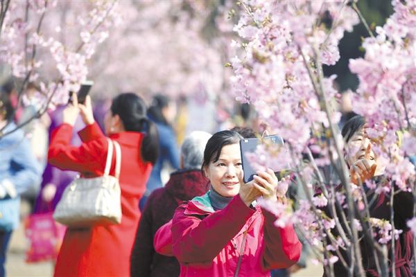3月18日,游客在玉渊潭公园樱花园早樱树下赏花拍照。