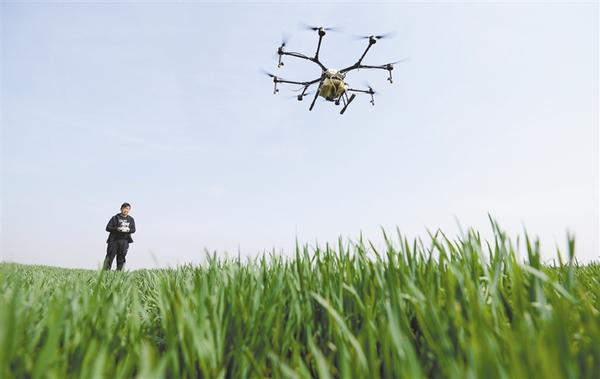3月19日,河北省邯郸市磁县朝冠村村民遥控植保无人机进行喷药作业。