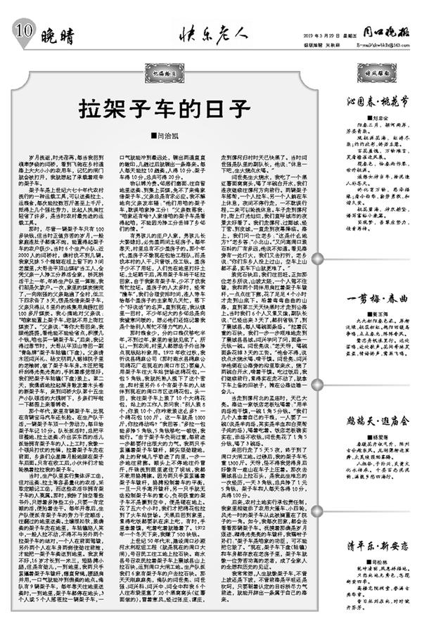 那时,尽管一辆架子车只有100多块钱,但当时正值穷苦的岁月,一般家庭连肚子都填不饱,能置得起架子车的农户极少。当时6个生产小队、近2000人的闫桥村,满村找不到几辆。我家兄妹5个蜷缩在祖上留下的3间老屋里,大哥去平顶山煤矿当工人,全凭父亲一人挣工分养活全家,拼死拼活干上一年,年终生产队里一算账,我们却是欠款户。一次,家里的煤炭烧完了,一向刚强的父亲跑遍了全村,低三下四求告了3天,愣是没借来架子车,父亲只得从8里外的练集用肩膀扛回100多斤煤炭。我心痛地对父亲说:“咱家能置上架子车,您就不用上街扛煤炭了。”父亲说:“等你大哥回来,我跟他提提,看他能不能俭省点,积攒几个钱,咱也买一辆架子车。”后来,我记得过春节时,大哥从平顶山带回一副“青岛牌”架子车轱辘(下盘)。父亲请木匠闫兴礼、杨文明两人锯掉院子里的老榆树,做了架子车车身。木匠把驾杆刮得光亮光亮的,手抓着感觉很好,我们把架子车轱辘(下盘)装上。第二天,我潇洒地拉起浑身散发着木头香的新架子车,来到闫桥大队第十五生产小队领活的大槐树下,乡亲们呼啦一下都围上来看稀奇。