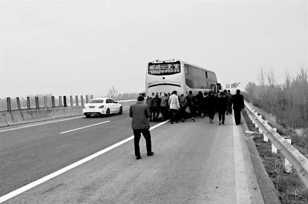 本报讯 3月29日下午,前往大广高速扶沟中队辖区路段督导检查工作的市公安局交通管理支队高速二大队副大队长杨凯看到几十名乘客在高速公路上推一辆大巴车(如图)后,紧急通知该大队扶沟中队值班民警前来处置。经杨凯和值班民警紧急救援,几十名乘客得到妥善安置。