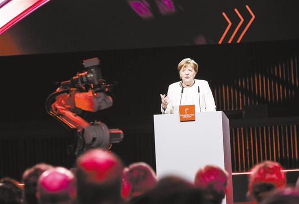 3月31日,在德国汉诺威,德国总理默克尔在2019年汉诺威工博会开幕式上致辞。