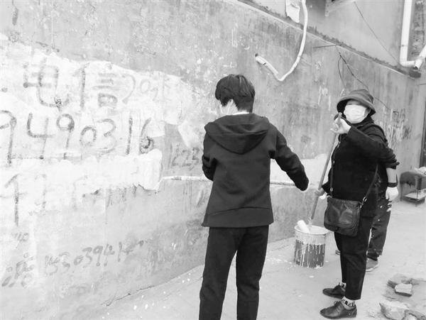 4月5日至6日,项城市水寨办事处古楼社区工作人员在仁和街清理小广告。对于粘贴小广告,他们先用手撕,然后喷水,过一会儿用铲子清理干净。对于喷在墙上的小广告,他们则一一用涂料覆盖。附近居民张先生说:“没有了小广告,城市的街道干净漂亮多了!” 记者 田孝臣 摄