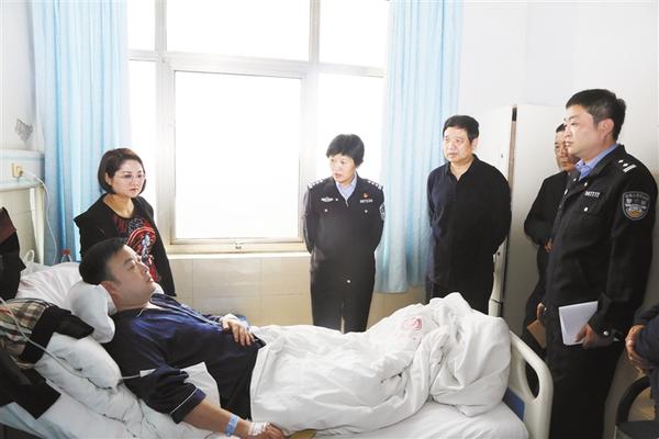 4月8日上午,市公安局党委委员、政治部主任郭冰等人到市中医院看望慰问因公负伤民警(如图)。