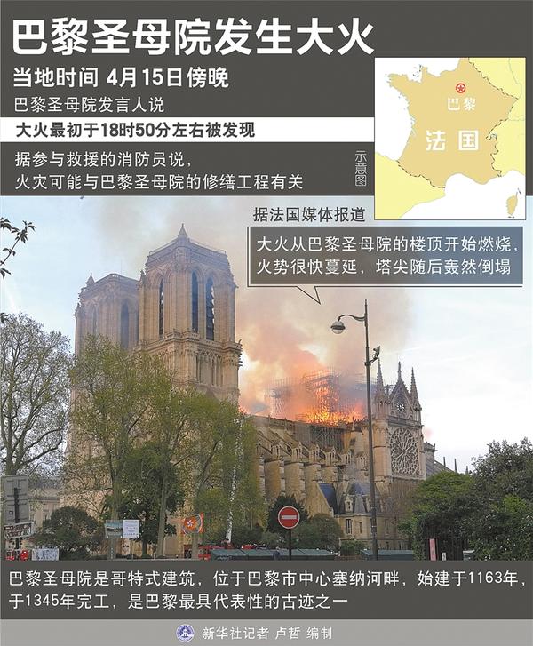火灾发生时,巴黎圣母院正处于维修施工之中。巴黎市长安妮·伊达尔戈介绍,由于维修施工,巴黎圣母院内部分艺术品早就被转移走,得以躲过此劫。