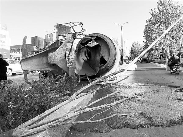 4月18日7时许,在中心城区大庆路与黄河路交叉口附近,一辆水泥罐车在拐弯时因车速过快,翻倒在绿化带中“动弹不得”,所幸并无人员伤亡。交警提醒,在转弯时即使没有行人,车辆也要减速慢行。 记者 彭慧 摄