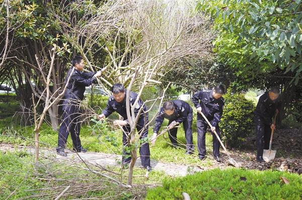 我市召开创建国家卫生城市百日冲刺动员大会以来,市公安局犯罪侦查支队指挥室党支部号召党员民警从身边做起、从小事做起、从点滴做起,以实际行动积极参与“创卫”工作。图为4月28日上午,民警在营区修剪花木、清扫残叶。记者 窦娜 摄