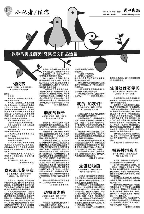 4月20日,我参加了市自然资源和规划局举办的“爱鸟周”宣传活动启动仪式。野生动物保护专家给我们讲了有关鸟类的知识和保护鸟类的重要性,并领着我们参观了周口动物园。