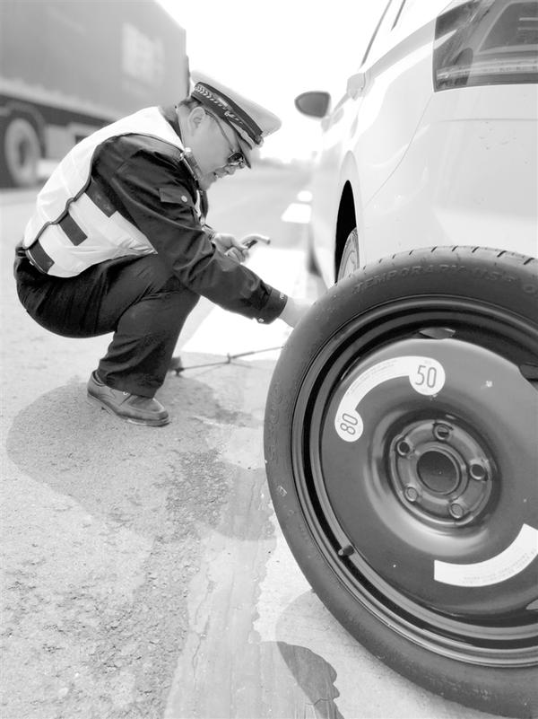 好不容易将车辆停在了应急车道内,李女士又发起愁来,因为她不会换轮胎。正在她一筹莫展之际,正在巡逻的高速交警周豪、刘杰驾车停在了她身边。