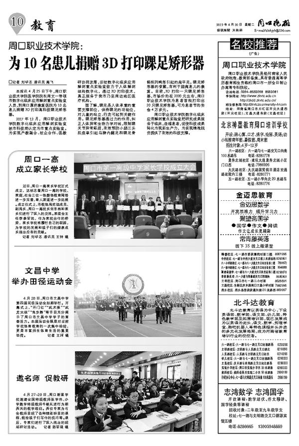本报讯 4月25日下午,周口职业技术学院医学院院长周文一带领市数字化临床应用解剖重点实验室人员,到周口惠济康复医院为10名患儿捐赠3D打印高科技踝足矫形器。