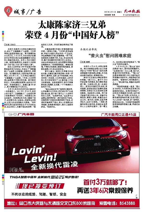 本报讯 陈家济三兄弟在太康投资创业,成立了“太康壹家人”公益团。三兄弟带领公益团坚持做公益,累计捐赠资金250多万元。4月29日,中央文明办在重庆市沙坪坝区举办全国道德模范与身边好人现场交流活动,发布4月份中国好人榜。经网友推荐评议,陈家济三兄弟荣登4月份“助人为乐”类“中国好人榜”。