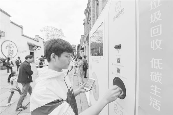 5月5日,在福州市三坊七巷历史文化街区,游客扫码后将废弃饮料瓶投入数字化智能回收设备中,换取环保书签。