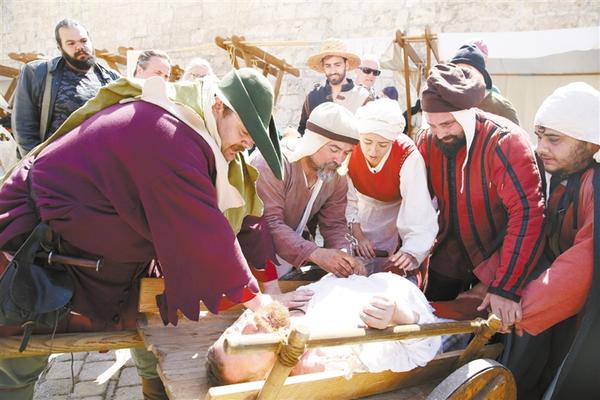 5月5日,在马耳他姆迪纳古城举行的中世纪文化节上,一群身着欧洲中世纪时期服饰的演员再现中世纪医生给病人做手术的场景。