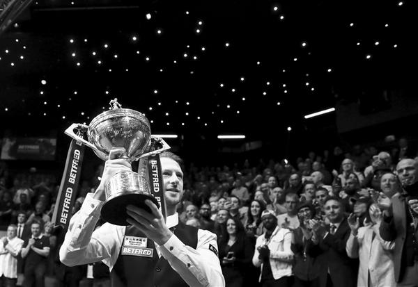 图为2019年5月6日,特鲁姆普捧起世界斯诺克锦标赛冠军奖杯。
