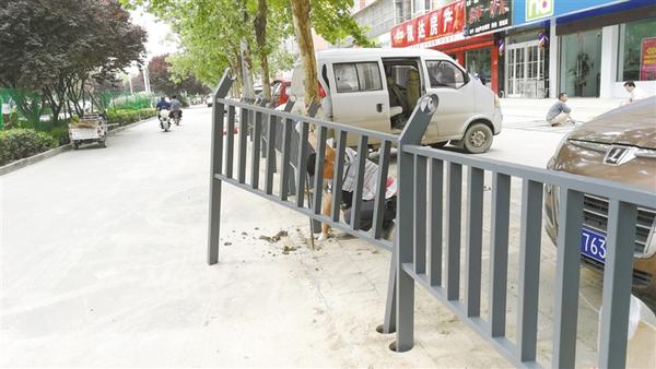 昨日,记者在中心城区庆丰路与周口大道交叉口西侧看到,几十名工人在紧张有序地安装人行道隔离栏,有的在地上钻孔,有的在搬运隔离栏。这种隔离栏高度约1米,能有效避免机动车辆占用人行道。与人行道隔离栏安装工作同期进行的,还有庆丰路绿化带内隔离网的安装,目的是防止行人穿越绿化带。