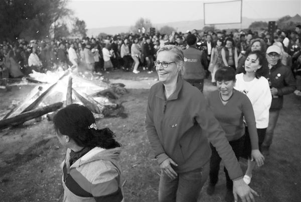 图为当日傍晚在甘肃省临洮县马家窑村瓦家坪,中外嘉宾和当地群众围着篝火跳舞。