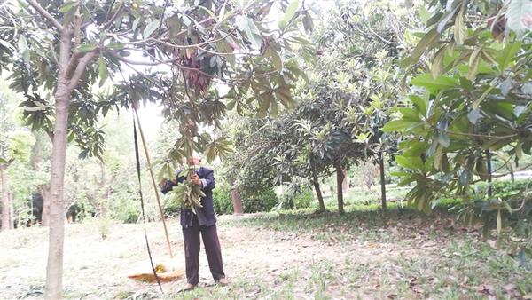 5月20日早上,在周口中心城区文昌大道与府苑街交叉口西侧的街头小游园内,一位老人正在采摘枇杷树上还未完全成熟的枇杷果。记者看到,老人已采摘了一些枇杷果,地上落了不少树叶。