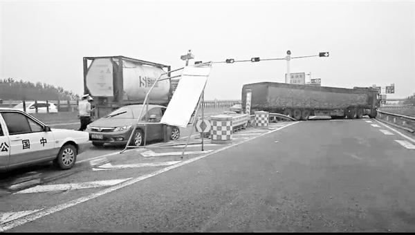 当日上午,接到指令后,高速二大队事故中队民警王航程带领队员王宇涛、王博带齐装备立即赶往事故现场。“当时是一起双方事故,一辆满载货物的半挂货车碰撞一辆轿车后,从大广高速主道撞破护栏东北至西南方向横在转往宁洛高速方向的匝道出口处,完全把道路堵死,轿车上有一人重伤。”王航程说。