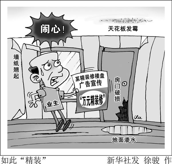 “新华视点”记者调查发现,事实上所谓“万元精装修”的实际标准仅为几百元,“名牌产品”实为不知名小工厂生产的。部分开发商一味追求压缩成本,导致装修质量问题频发。近日,住建部办公厅发布通知,在全国范围内开展建筑市场和工程质量安全监督执法检查。