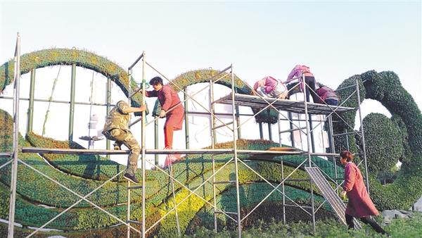 5月21日6时许,周口市中心城区文昌大道与周口大道交叉口东侧的街头游园内,工人们用花草布置景观造型。据悉,5月20日下午,我市召开创建国家卫生城市攻坚战誓师大会。会议要求,集中全力,克难攻坚,利用最后十多天时间,做好迎接省“创卫”暗访组检查的全部准备,坚决拿下“创卫”资格和路条。记者 关秋丽 摄