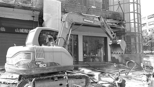 5月25日,周口市中心城区育新路与五一路交叉口附近,一辆挖掘机正在拆除临街的违章建筑。记者 关秋丽 摄