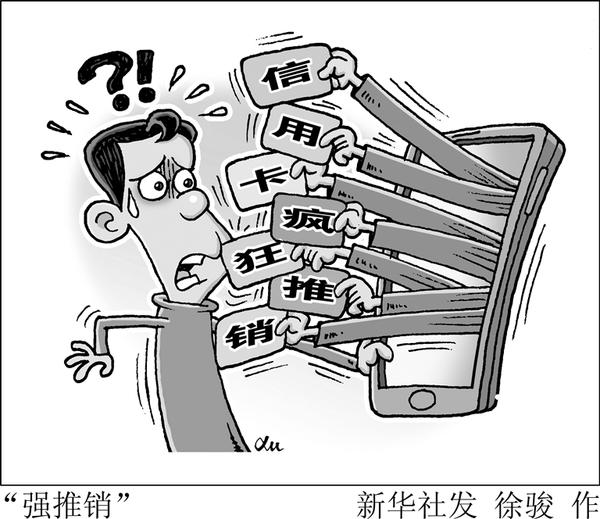 “鉴于您信用优良,已成为我行信用卡优选用户,点击立即申领。”这样的信用卡短信推销,每天都像病毒一样发送到很多人的手机上。记者调查发现,近年来,由于银行在信用卡业务上的激烈竞争,争相“拼规模”“抢市场份额”,病毒式的畸形营销愈演愈烈。新华社发 徐骏 作