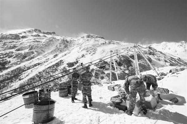 索道建好之前,每隔一段时间,他们要下山“背菜”、背物资。每年大雪封山前,他们还要“冬囤”。徒步攀爬雪山运送物资通常需要5个小时,官兵们负重爬冰卧雪穿过“忘乡坡”“忘情坡”“忘忧坡”3个危险的陡坡,其难度可想而知。