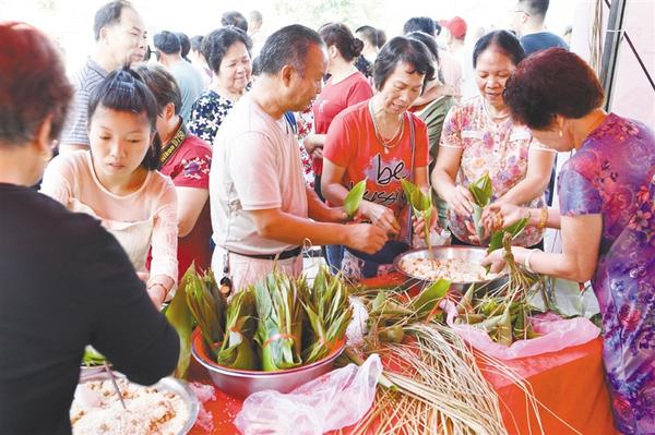6月4日,人们在活动中聚在一起包粽子。