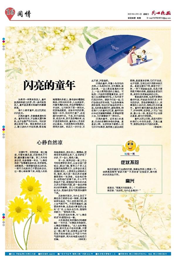 闪亮的童年,有着小鸟羽毛的光泽。小鸟是好伙伴,羽毛靓丽,姿态优美,一会儿落在高高的大树上,一会儿落到院里的土墙边。可能是一只独自玩耍惬意觅食,也可能三五成群嬉戏对唱。小鸟对孩子们是友好的,跟孩子们在一起,它们会使出所有本领,飞出各种高难度的姿势,唱出它们能会的所有小曲。鸟的歌曲真好听,婉转清亮,响在每个人的童年记忆里。童年时的伙伴还有蝴蝶和蜻蜓,有青蛙和萤火虫,它们都像孩子一样快乐。