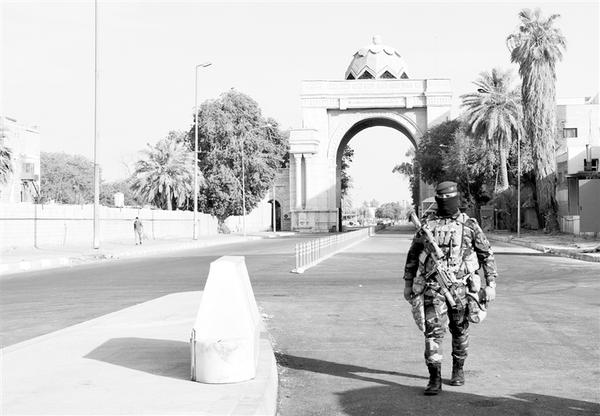 图为6月4日,在伊拉克首都巴格达,一名士兵在“绿区”入口警戒。 新华社发
