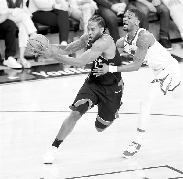 6月5日,猛龙队球员伦纳德(左)在比赛中上篮。