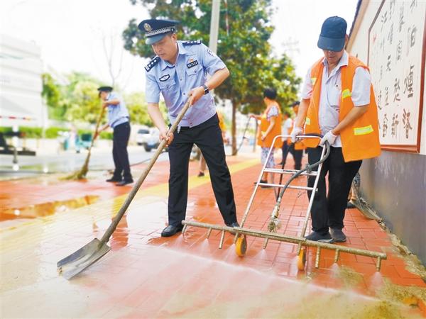 6月10日上午,市公安局国保和反恐怖支队民警对中心城区常青路北段的主干道和新铺的人行道进行彻底清洗,干净的路面让市民眼前一亮。图为民警和环卫工人在清洗路面。记者 姬慧洋 实习生 李佳欣 摄