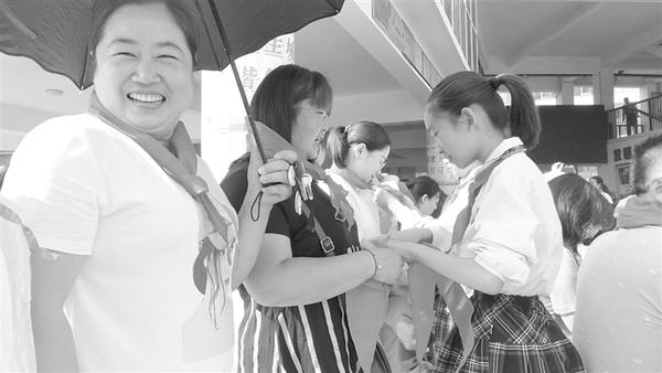近日,周口市文昌小学对在2018~2019学年“协同育人”活动中表现突出的百余名家长进行了表彰。据了解,该校一直注重家校同步教育,充分发挥家长在孩子教育中的积极作用,取得了显著成效。图为该校少先队员为优秀家长佩戴红领巾。