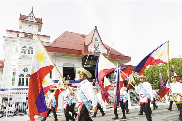当地时间6月12日,在菲律宾甲米地省,人们挥舞国旗参加独立日庆典。