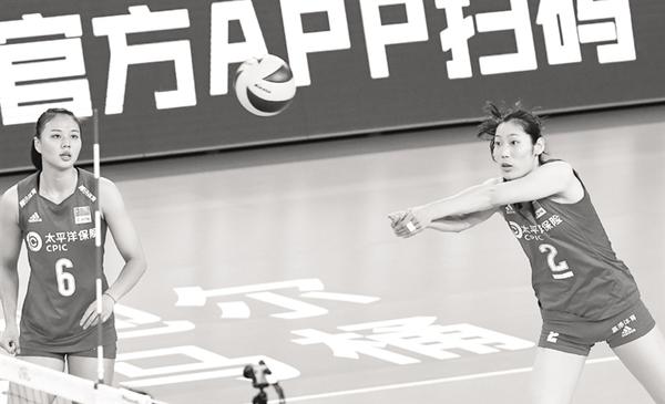 6月11日,中国队球员朱婷(右)在比赛中垫球。