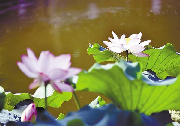 近日,笔者在周口人民公园内看到,落花湖里的荷花竞相开放。阳光下,碧绿的荷叶、圆润的水珠将粉色荷花映衬得格外娇艳,引得许多市民驻足欣赏。