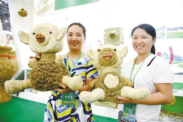 2019安徽秸秆综合利用产业博览会在合肥举行,参展商展出秸秆编织的卡通玩具(6月17日摄)。