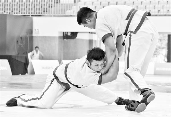 6月27日,在男子82公斤级比赛中,陕西省举重摔跤柔道运动管理中心选手额伊勒斯格(右)战胜重庆市运动技术学院选手贺小满。