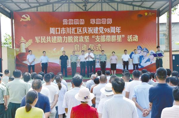 6月29日下午,为庆祝建党98周年,川汇区军民共建助力脱贫攻坚“支部带群星”活动启动仪式在城北办事处邵寨村举行。周口军分区副司令员薛振喜、政治工作处主任李扬和川汇区政府、川汇区武装部有关领导为31名现役军人、退役军人以及脱贫致富典型等“群星”颁发牌匾和奖金。记者 陈永团 彭慧 摄